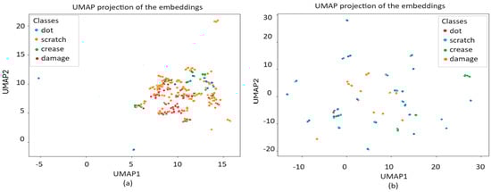 In this section, we present the UMAP projections of the embeddings from both the DeiT and VGG19 models. The UMAP projections of the embeddings of VGG19 and DeiT models are depicted in Figure 3a and Figure 3b, respectively. For example, Figure 3a demonstrates the integration of UMAP and the embedding projections derived from the VGG19 model. The plot shows the distribution of the embeddings across damage feature classes, such as dot, scratch, crease, and damage. Similarly, Figure 3b illustrates the UMAP projection of the embeddings using the DeiT model, with the embeddings for the same set of defect classes (scratch, damage, crease, and dot) visualized. These figures provide a visual representation of how each model encodes the different classes within the embedding space.