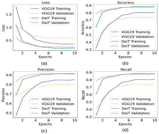 We assessed the performance of two different deep learning models, VGG19 and DeiT, over ten training epochs, using various metrics: loss, accuracy, precision, and recall. The evaluation was conducted separately for both the training and validation datasets. The results are presented in Figure 4 and Table 4. The training phase for VGG19 showed a consistent decrease in loss from 1.796 to 0.354, demonstrating effective learning across epochs. The accuracy improved significantly from 31.36% in the first epoch to 80.49% by the tenth epoch. Similarly, precision and recall all exhibited upward trends, indicating improved predictive performance and reliability of the model over time. In the validation phase, the loss for VGG19 decreased from 1.054 to 0.590, and accuracy saw a steady increase, reaching up to 73.40% in the final epoch. For the DeiT model, the training metrics showed a sharp reduction in loss from 1.091 to 0.204, paired with a notable increase in accuracy from 59.77% to 88.19%. The precision and recall metrics showed a similar pattern, highlighting the model’s growing ability to classify accurately and with minimal errors. Validation results for DeiT further confirmed its robustness, with loss tapering down from 0.606 to 0.244 and accuracy progressively climbing to 87.71% by the tenth epoch. Precision remained exceptionally high, showcasing the model’s consistent performance.