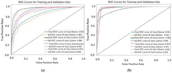 VGG19 ROC (Receiver Operation Characteristic) curve analysis: The ROC curves for the VGG19 model, as shown in Figure 5a, demonstrate the model’s performance across four classes during the training and validation phases. The AUC (area under the curve) scores for the training sets are 0.85 for class 0, 0.97 for class 1, 0.93 for class 2, and 0.93 for class 3. In the validation sets, the AUC scores are slightly lower at 0.81 for class 0, 0.96 for class 1, 0.90 for class 2, and 0.90 for class 3. For the DeiT model, illustrated in Figure 5b, the ROC curves highlight consistent and high performance across all classes. The training phase AUC scores are impressive: 0.94 for class 0, 0.98 for class 1, 0.97 for class 2, and 0.99 for class 3. The validation phase maintains this high level of performance, with AUC scores of 0.95 for class 0, 0.98 for class 1, 0.97 for class 2, and 0.99 for class 3. These results showcase the DeiT model’s exceptional ability to classify defects accurately across all evaluated classes.