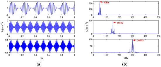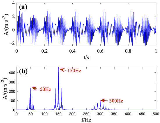 The dominant frequencies of each component are 50 Hz, 150 Hz, and 300 Hz, respectively, and the sampling frequency is 1000 Hz. The time domain waveform and frequency domain waveform of the synthesized simulation signal are shown in Figure 1.
