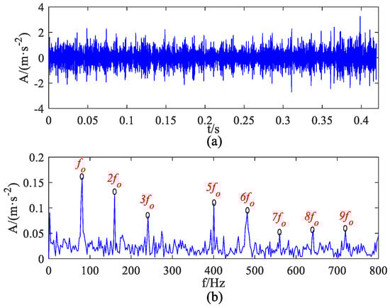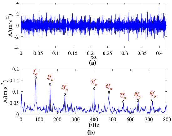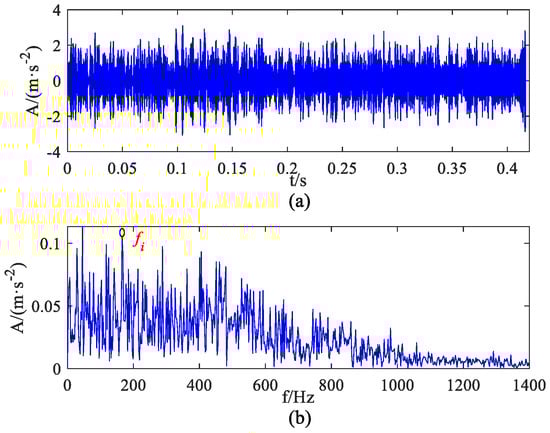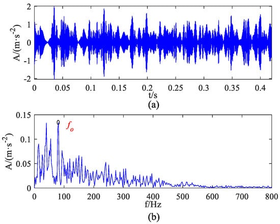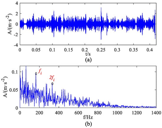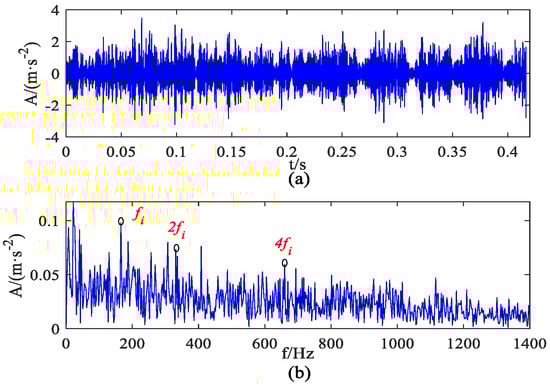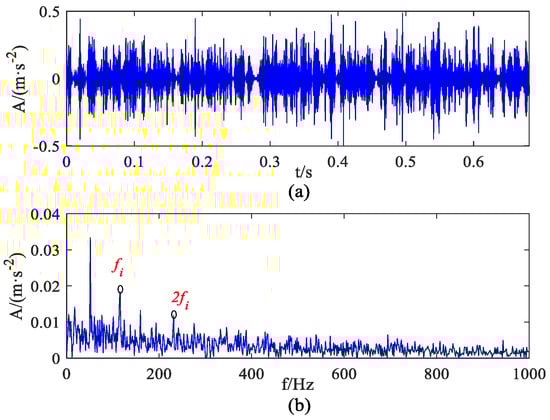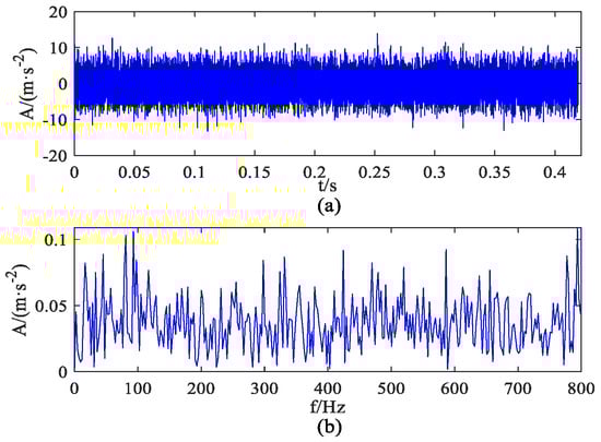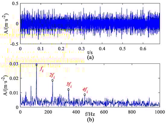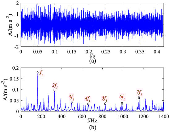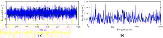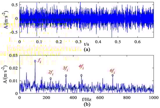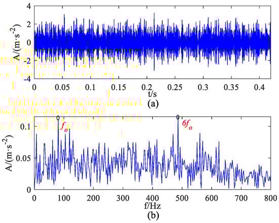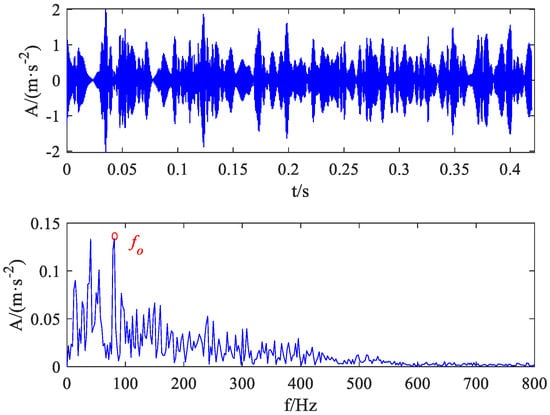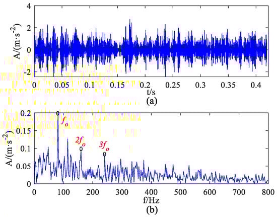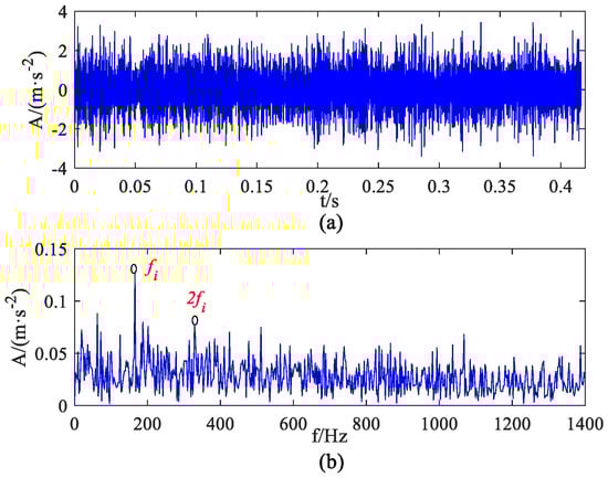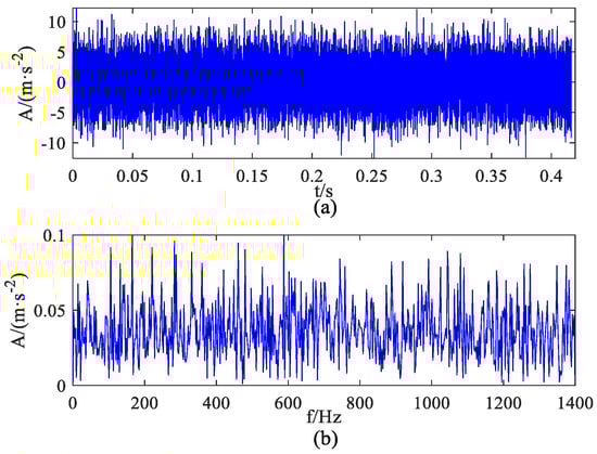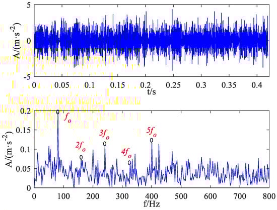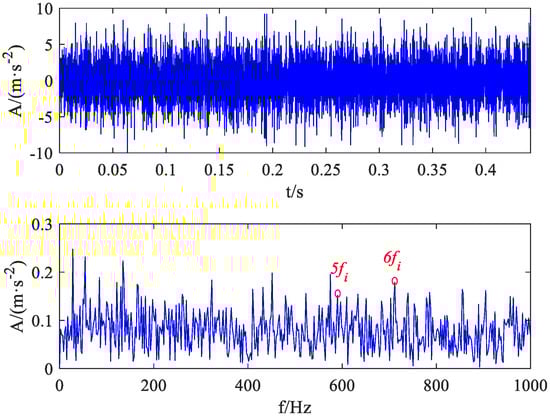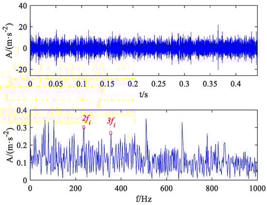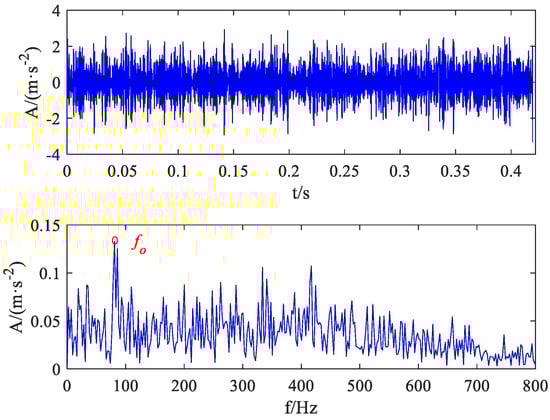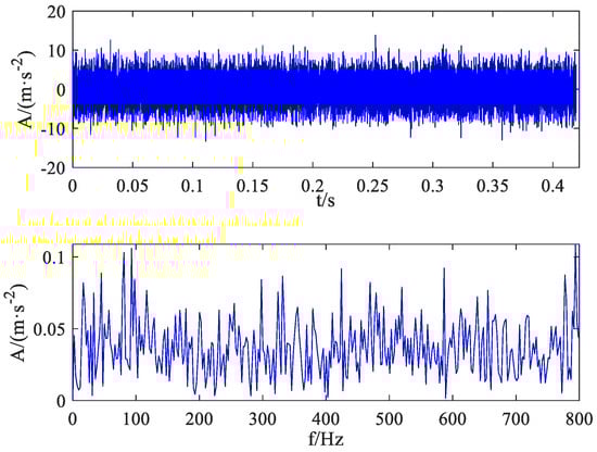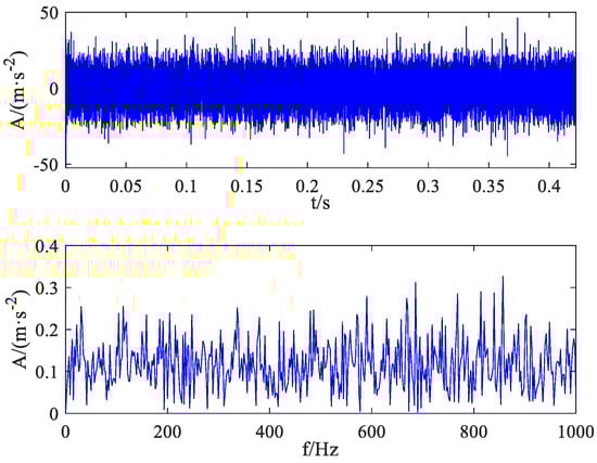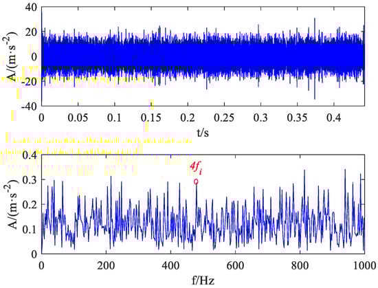 Figure 30 shows the time-domain waveform and envelope spectrum of the original outer ring fault signal. From Figure 30, it can be seen that the fault characteristics are completely submerged, and no information related to the frequency of the fault characteristics can be observed. Thus, the type of bearing fault is determined to be impossible.
