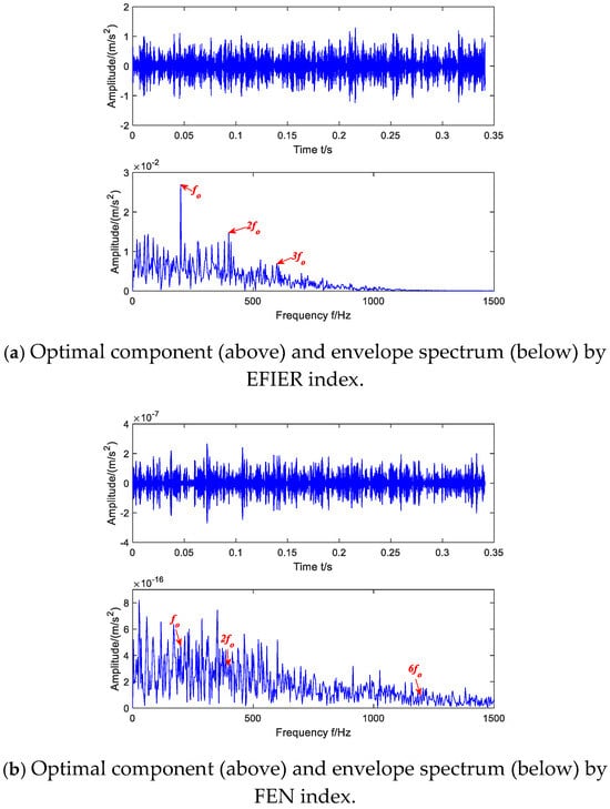 where represents the overall energy of the envelope signal; denotes the envelope fault information energy; represents the number of sampling points; de notes the fault characteristic frequency; and denotes the sampling frequency. The EFIER measures the fault shock portion of the IMF component signal using the fault eigenfrequency. In the EFIER, the envelope energy of the impact component corresponding to a frequency that represents a fault characteristic is first determined, and the effective IMF component is then selected based on the proportion of the fault envelope energy to the total envelope energy. As the theoretical values of the fault eigenfrequency differ from the actual values, the energy of the peak close to the fault eigenfrequency is selected to serve as the envelope fault information energy. Calculating the index values of all conceivable fault types is essential if this index is to be utilized to monitor operating conditions or diagnose unidentified faults. It is possible to determine the characteristic frequencies of various fault types using Equations (21)–(23). The EFIER for different faults is calculated in turn when the fault characteristic frequency is calculated.