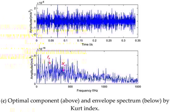 Figure 34, Figure 35 and Figure 36 show the time-domain waveforms and envelope spectra of the sensitive components decomposed by the TVF-EMD, VMD, and CEEMDAN methods, respectively. From Figure 33, Figure 34 and Figure 35, it can be seen that the fault feature information extracted using the method proposed in this paper (Figure 35 and Figure 36) is more abundant with fewer noise interference components, and early fault features of bearings can be extracted more accurately by achieving the accurate identification of fault types. However, TVF-EMD, VMD, and CEEMDAN methods cannot effectively detect the characteristic frequencies of outer ring faults. The best performing VMD method can only observe and and is greatly affected by noise, while other frequency multiplication information cannot be found.
