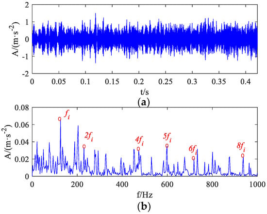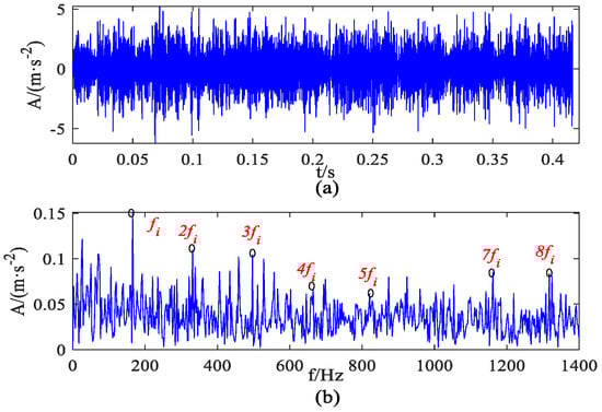 Figure 32 shows the time-domain waveform and envelope spectrum of the optimal fusion component OC (IMF5 + IMF4). In Figure 32, the outer ring fault characteristic frequencies ~ can be observed. It indicates that the fused component OC according to the EFIER maximum principle contains more fault characteristic information.