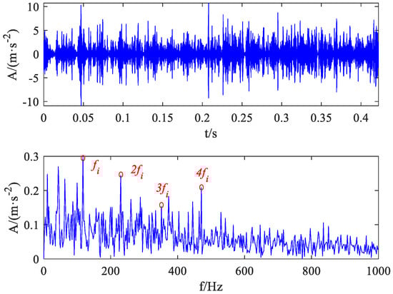 Figure 41, Figure 42 and Figure 43 show the time-domain waveforms and envelope spectrum of the sensitive components decomposed by the TVF-EMD, VMD, and CEEMDAN methods, respectively. Comparing the results obtained by the proposed method with Figure 41, Figure 42 and Figure 43, it can be seen that the fault feature information extracted by the method in this paper is richer with fewer noise interference components and that the method in this paper can more accurately extract early fault features of bearings. For fault signals of the inner ring, the TVF-EMD method has the best effect among the TVF-EMD, VMD, and CEEMDAN methods. However, only the inner ring characteristic frequencies and can be observed in the results extracted by the TVF-EMD method, and it is not possible to find other frequency multiplications effectively due to noise interference.