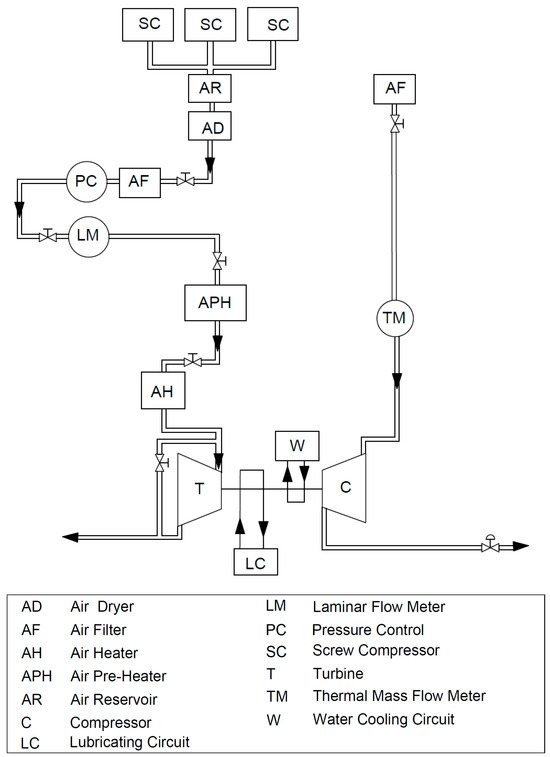 The experimental activity presented in this article was conducted on a wastegated turbocharger turbine for spark ignition engines at the test facility for components of propulsion systems of the University of Genoa (observable in Figure 1 and fully described in [32]). Given its importance for this research, the waste-gate valve channel has been schematized as a circuit operating in parallel with the turbine. It is important to note that this component is, in reality, highly integrated into the turbine volute. Consequently, the assessment of the flow rate should consider the overall mass flow rate of the turbocharger turbine, accounting for the contributions of both the rotor and the waste-gate valve channels. The test rig is equipped with two separate lines for compressor and turbine characterized by a maximum air mass flow rate of 0.8 kg/s, and an electric heater station enables turbine inlet temperatures to reach up to 600 °C depending on the tested turbine size. Furthermore, a thermostatic system ensures accurate control of temperatures, pressures, and flow rates of lubricating oil and cooling water.