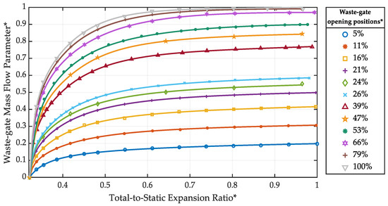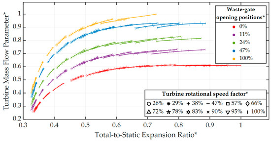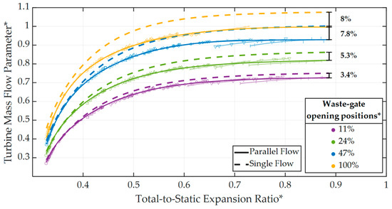 Turbine mass flow parameter normalized map for different positions of the waste-gate valve (parallel-flow conditions) [31].