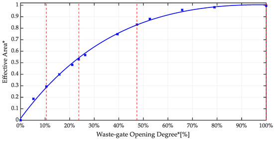 Waste-gate valve effective area normalized versus its position in single-flow conditions [31].