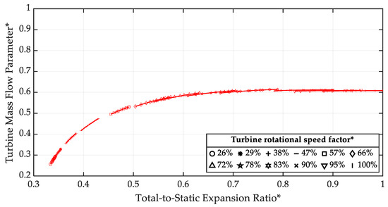 Turbine mass flow rate parameter normalized map with the waste-gate valve kept closed (single-flow conditions).