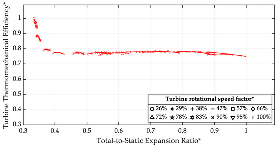 This last information is generally provided by the turbocharger manufacturer, and it is the base for the development of any modeling activity on turbocharging systems. In Figure 4 and Figure 5, the characteristic curves of the turbine, both in terms of swallowing capacity and thermomechanical efficiency are shown. Regarding thermomechanical efficiency, despite the necessity to represent non-dimensional values for confidentiality reasons, it can be stated that at lower expansion ratios (i.e., lower turbocharger rotational speeds) heat transfer effects became significant [33,34]. Equation (7) highlights the dependence of thermomechanical efficiency on the compressor power, which acts as a dynamometer in the case of turbine testing. The compressor power is affected by the heat transfer phenomena from the turbine side to the compressor, leading to an overestimation of the measured values of the compressor outlet temperature.