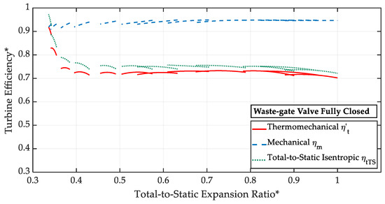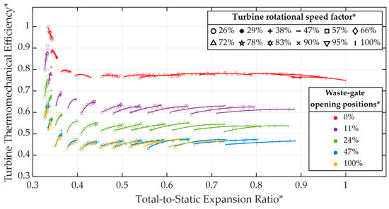 Turbine thermomechanical efficiency normalized map for different positions of the waste-gate valve (parallel-flow conditions) [31].