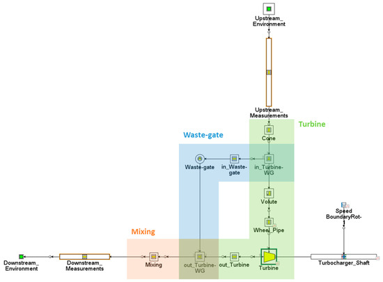 The model is presented in Figure 9, highlighting three main areas of interest: the turbine (in green), the waste-gate valve (in blue), and the mixing zone (in orange), along with the measurement stations used for experimental characterization.