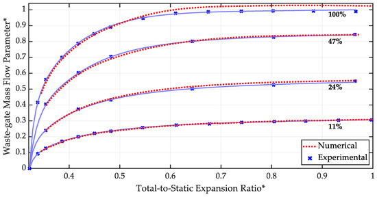 Once the single-flow operation of both the waste-gate valve and the turbine is validated, the modeling activity continued with the evaluation of the turbine behavior in parallel-flow conditions, where both the impeller and the wastegate circuits are open at the same time. The model results are presented in Figure 15 for waste-gate valve opening positions experienced during the experimental campaign (11%, 24%, 47%, and 100%). These results were obtained by imposing the effective orifice diameter corresponding to the analyzed waste-gate valve positions and turbine rotational speed levels considered. It must be remarked that the system was treated as its behavior in single-flow conditions with no additional adjustments or tuning applied to the model referred to as the parallel-flow operation. A good agreement between experimental data (blue lines) and numerical results (red lines) is reported in Figure 15. The average difference between the model and experimental results is around 2%, which is considered acceptable with reference to the accuracy of the sensors adopted. Hence, the model appears to effectively estimate the increase in the turbine mass flow rate in parallel-flow conditions as the waste-gate valve openings increase.