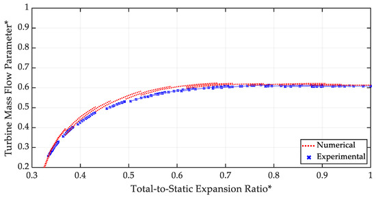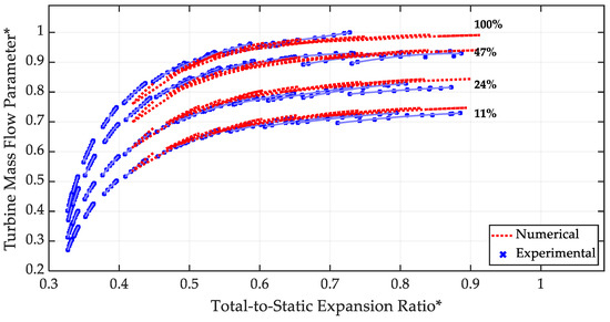 The turbine model in single-flow operation was then analyzed. In particular, for the turbine mass flow rate parameter, the same procedure used for the waste-gate valve was adopted; a good agreement between experimental data (in solid blue lines) and the numerical data (in dotted red lines) can be observed in Figure 12 with a maximum deviation of 4.35% with respect to experimental results.