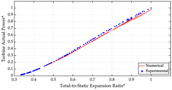 As a further validation of the approach used for the evaluation of turbine efficiency and power levels, Figure 14 shows the trend of the turbine actual power (shown in blue) experimentally evaluated as the ratio between the power absorbed by the compressor and the mechanical efficiency, compared to the turbine power calculated through the 1D Model (shown in red in Figure 14). This last information is calculated at the rotor level in the turbine tool of GT-Power considering expansion ratio and temperature levels to guarantee coherence between the model and the experimental setup.