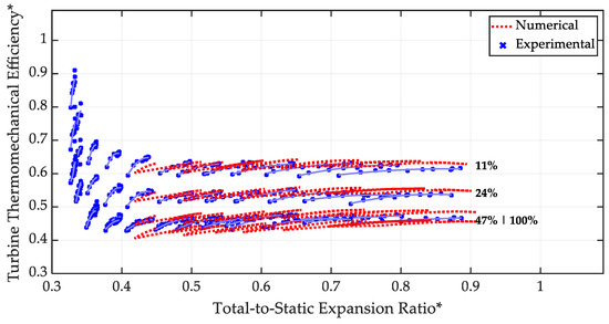 In Figure 16, the same analysis is reported with reference to thermomechanical efficiency values. The maximum deviation between experimental and numerical data is around 2%, which represents a satisfactory result. Then, a more detailed analysis of the flow split between the turbine rotor and the waste-gate port in parallel-flow conditions was conducted. Since the overall mass flow rate has been previously validated and the mass flow rate through the impeller is crucial to assess the turbine thermomechanical efficiency, it is possible to analyze how the mass flow rates are divided between the two channels in a parallel-flow configuration. This last information is crucial for the evaluation of the distribution of mass flow rates between the two channels. The thermomechanical efficiency depends not only on the overall turbine mass flow rate (validated in Figure 15) but also on the actual mass flow rate through the rotor, which is responsible for power delivered to the turbocharger shaft. Thanks to this information, the split of the mass flow rate through the by-pass port and the turbine rotor in parallel-flow conditions can be analyzed.
