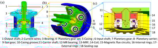 Figure 1a shows the 3D model of the proposed MR gearbox. It mainly consists of input and output shafts (#6 and 1), a planetary gear set (#4), two bearings (#3), and a casing (#5). As the core component of the MR gearbox, the planetary gear set is magnified and presented in Figure 1b. It is comprised of a sun gear (#9), four planetary gears (#7), a planetary carrier (#8), and a casing groove (#10). The casing groove with inward-facing teeth is embedded in the internal surface of the casing, and it acts as a ring gear in the planetary gear set. The planetary gears mesh with the sun gear and the casing groove for the torque transmission between them. To clearly demonstrate the internal design, one of the planetary gears is also magnified and shown in Figure 1c. It is seen that the gear (#7) is connected to the carrier shaft (#11) with an MR bearing (#12) in between. The internal ring (#16) and the external ring (#17) of the MR bearing are fixed with the carrier shaft and the planetary, respectively. The most significant difference of this MR bearing is that it has MRF (#13, MRF-140CG, Lord Corp., Cary, NC, USA) filled all the chambers formed by the internal ring (#16), external ring (#17) and sealed caps (#18). Above the MRF bearing, a set of electromagnetic coils (#14) is also fixed to the carrier shaft, providing a magnetic field to the MRF. The magnetic circuit is presented by the red vector line (#15, Figure 1c). Four sets of electromagnetic coils for the four planetary gears are connected in series with the wire (#2, Figure 1a) going out through the hole in the output shaft. Given the smart nature of the MRF, the MR bearing plays a significant role in controlling the relative motion between the planetary gear and the carrier shafts.