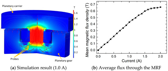 As the reasonable distribution of magnetic fields is the key to the successful control of the MR gearbox, magnetic field simulation was conducted using COMSOL 5.5 Multiphysics. Figure 2a shows the result when the coil (100 turns, 0.2 mm diameter, 14.3 Ω) is supplied with a current of 1.0 A. It is seen that magnetic circuits indicated by red arrows have been generated, and the magnetic flux perpendicularly passes the MR bearings. The mean magnetic flux density of the areas in between the bearing’s balls and the internal ring is presented in Figure 2b, which is obtained by averaging the magnetic flux density readings of 10 probes shown in Figure 2a. It is noticed that the mean magnetic flux density increases linearly with respect to the current until the current reaches 0.6 A, after which saturation is observed. In addition, 1.0 A current yields a mean magnetic flux density of 0.629 T, which is enough for the control, given that 0.6–0.7 T will make MRF saturated.