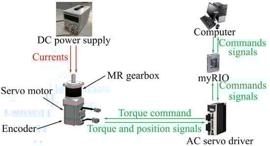 The prototyped MR gearbox was characterized by the test shown in Figure 3 to verify its damping variability. The gearbox is fixed to a servo motor (MHMF042L1V2M, Panasonic, Newark, NJ, USA), which is controlled by an AC servo driver (MBDLT25SF, Panasonic, Newark, NJ, USA). A computer with a Labview program sends commands to the driver via an NI myRIO. The encoder can measure the real-time torque output and the displacement of the motor. By multiplying these data with the gear ratio of the gearbox, the real-time torque output and the displacement of the MR gearbox can be recorded. A DC power supply provides currents to the MR gearbox to regulate the coil current. During the test, a harmonic displacement signal with a frequency of 0.5 Hz and an amplitude of 20° was selected as the excitation. Considering the maximum sustainable coil current, currents from 0 to 1 A with an increment of 0.2 A were applied.