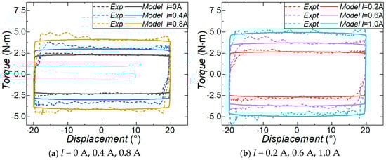 To acquire the parameters in Equations (2) and (3), a mathematical model was built in MATLAB R2022b/Simulink. Then, based on the experimental test results in Figure 4a, the parameters were identified by using the parameter estimation tool in Simulink with the nonlinear least-squares method and trust-region reflective algorithm. The principle of this tool is to optimize parameters in order to match the modelled results with the experimental results. The identified parameters are presented in Table 1. It is seen that, as the current rises, and increase while the rest parameters are constants. Figure 5 compares the torque–displacement responses of the modeled results with the experimental results. It is seen that the modelling results (solid lines) obtained with the established model and the identified parameters fit the experimental data (dashed lines) well, indicating the proposed model is able to describe the behavior of the gearbox.