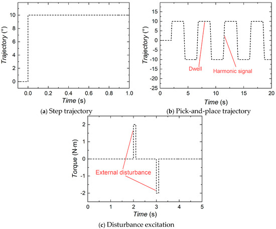 To assess the positioning control performance of the robotic arm, two trajectories are designed for the robotic arm to trace, as shown in Figure 7a,b. The first one (Figure 7a) is a step trajectory, which gives a 10° step at t = 0 s to drive the robotic arm to move from 0 to 10°. This trajectory is used to test the response of the robotic arm system when an instant command is given. The second one (Figure 7b) is a pick-and-place trajectory comprised of the harmonic signal with an amplitude of 10° and a frequency of 1.3 Hz and two-second dwells arranged at the position of 10° and −10°. The trajectory simulates the pick-and-place movement, commanding the robotic arm to pick a component at 10° and then place it at −10°. To test the anti-disturbance performance of the robotic arm, a disturbance excitation shown in Figure 7c was also designed, where a disturbing torque of 2 N⋅m lasting 0.1 s was applied to the robotic arm at the second and third seconds, respectively, from different directions when the arm was at the neutral position (0°).