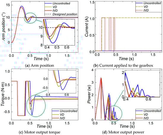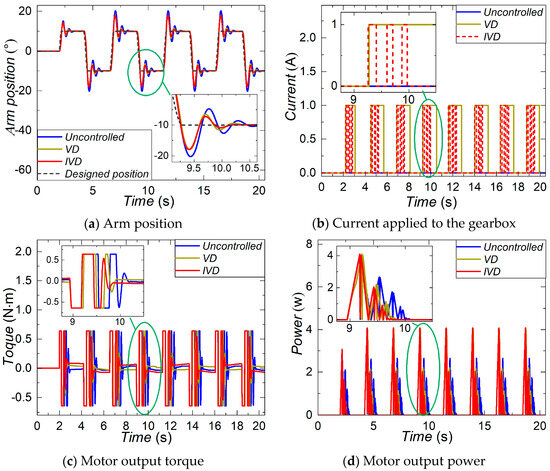 Figure 13a shows the positioning controlling performances of the robotic arm under three control modes. It is seen that the robotic arm performs smaller overshoots under VD and IVD modes and that the arm under those two modes reaches the steady state without oscillation much sooner than under the uncontrolled mode. Figure 13b shows the generated current signal by the IVD controller, Figure 13c shows the real-time output torque of the motor over time, and Figure 13d calculates and shows the consumed power for the three control cases. It is observed that IVD control can save a large proportion of energy than the VD mode. As illustrated in Figure 13a–c, when the robotic arm moves from 0° to 10°, the motor torque output is in the same direction of the movement, and no current is applied to the gearbox in the VD and IVD modes. After the occurrence of overshoots (t = 0.440 s), the motor torque turns negative to pull the arm back to the target position; meanwhile, both VD and IVD modes supply current to the gearbox. When the arm reaches the peak of the overshoot, the absolute motor torque tends to reduce, and at the same time, the IVD control mode stops supplying current while the VD mode keeps outputting current signals to the gearbox. Therefore, as indicated in Figure 13b, the IVD mode performs large current/damping only when the arm is leaving the target position, and it can save more energy than the VD mode, which applies constant large current/damping.