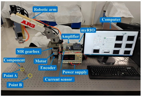 A testing platform shown in Figure 12 was established to experimentally evaluate the positioning and anti-disturbance performance of the robotic arm. In this platform, a six-DOF robotic arm (AR3, Beijing Times Brilliant Co., Ltd., Beijing, China) was installed on a plate, while the servo motor and the MR gearbox were installed under the plate to drive the robotic arm. The built-in encoder in the motor can record the real-time position of the arm and send the data to a computer via an NI myRIO. On the other hand, through a prepared Labview program, the computer sent commands to a motor driver (under the platform) to control the servo motor and the robotic arm; meanwhile, the current commands were also given to the amplifier via an NI myRIO to regulate the current applied to the MR gearbox. A current sensor was used to measure the currents applied to the MR gearbox in real-time, and the measured data was recorded via the NI myRIO. For the pick-and-place trajectory, a component was initially placed at point A (10°). The arm was driven to move from 0° to 10° to pick up the component and then move to point B to release the component. After completing one full circle, the arm would return to 10° and continue another cycle. The experiments under the two trajectories and the disturbance excitation were conducted.
