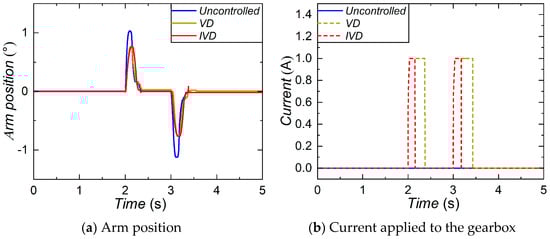 Figure 11 shows the simulation results when the robotic arm suffers external disturbance at the beginning of the second and the third seconds. By applying large damping, the arm positions under VD and IVD modes perform smaller disturbances than the uncontrolled mode in Figure 11a. As indicated in Table 4, 24.78% of disturbance is reduced in VD and IVD modes. Regarding the energy consumed by the MR gearbox, the IVD mode only consumed 2.065 J, which is significantly smaller than the VD mode (10 J). This is because the IVD mode only applies large currents when the robotic arm leaves the neutral position, as demonstrated in Figure 11b.