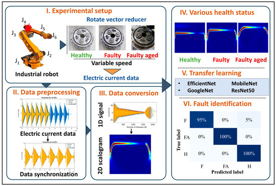 This study introduces a methodology for HM in industrial robots by analyzing electric current data from the RV reducer under three health conditions: healthy, faulty, and faulty aged. The process involves preprocessing and synchronizing the electric current signals, followed by converting one-dimensional signals into two-dimensional scalograms to enhance feature extraction. Advanced transfer learning models, including EfficientNet, MobileNet, GoogleNet, and ResNet50v2, are applied for fault classification. Figure 1 provides a detailed overview of the suggested methodology, which was carried out on an experimental test bench using an industrial robot from Hyundai Robotics Co. in a laboratory setting. In the fault diagnosis of the RV reducer, two fault types are simulated on reducers with different degradation levels, specifically on joint 4 of the robot. These conditions are categorized into three distinct states: healthy, faulty, and faulty aged. Initially, multiple sensors record voltage data through data acquisition modules, where data are subsequently transformed into electric current signals using current–voltage sensor calibration. Our technique relies on current signals from the RV reducer to detect and then classify problems. To improve the diagnostic value of these signals, the 1D time-domain current signals are first converted into 2D scalogram images. These images illustrate three distinct states of healthy, faulty, and aged faulty situations, providing a comprehensive visual representation of the characteristics of each signal. Transformation of raw signals into scalograms produces a data format that is better suited to deep learning models, which are adept at identifying intricate visual patterns. Four transfer learning models are applied to the scalogram picture data of the RV reducer for various speeds ranging (10 to 100)%, encompassing the architectures of EfficientNet, MobileNet, GoogleNet, and ResNET50v2.