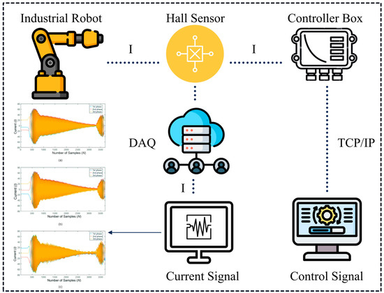 Data collection is facilitated by equipping the robot with sensors on each of its six axes. WCS6800 Hall-effect sensors are used to record electric current data for MCSA analysis. These embedded sensors are attached to the first, second, and third arms of the robotic motors, as well as on all six axes. To comprehensively monitor the robot’s performance, 18 sensors are installed to capture data across all phases of the fault induction process. These sensors interface with NIDAQ 9230 data acquisition modules, with the acquired data being systematically stored on a PC for in-depth analysis. Figure 3 provides a schematic of data acquisition setup, which consists of a control unit, DAQ modules, a function generator for precise signal calibration, Hall-effect sensors for current measurement, and a PC for data processing. Figure 3 demonstrates the connectivity between these components that facilitates seamless data flow.