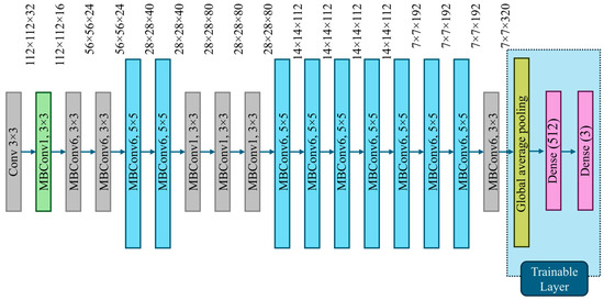 EfficientNet is a family of convolutional neural networks introduced by Tan et al. [57], designed to achieve a high level of accuracy while being computationally efficient. EfficientNet models scale uniformly across depth, width, and resolution using a compound scaling method, unlike traditional models that scale one dimension at a time. The scaling method optimizes each of these three dimensions to achieve a better trade-off between accuracy and efficiency. EfficientNet has become a prominent model in DL, especially for image classification applications that utilize the ImageNet dataset [57,58]. The primary aim of EfficientNet is to create more efficient models with fewer parameters while maintaining good accuracy. This is achieved by the technique known as compound scaling; this uniformly modifies the depth, width, and resolution of the network, resulting in improved performance while avoiding a proportional increase in processing requirements. The target network is developed by augmenting the baseline network through a compound scaling method that adjusts various parameters of the model according to specified resource limitations. Moreover, the architecture uses depth-wise separable convolutions, reducing processing requirements by a factor of k2, where k is the kernel size. The compound scaling approach consistently adjusts the depth (), width (), and resolution () of the model by means of a scaling coefficient ψ. This procedure is directed by constants α, β, and γ, which are refined by grid search within established resource limitations and guarantee effective use of computational resources [57]. The scaling equations are expressed as follows: