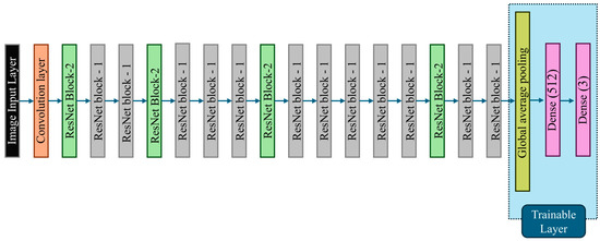 ResNET50v2 is a modified iteration of the ResNet-50 model aimed at enhancing training stability and convergence through the optimization of residual block architecture. This architecture has 50 layers, and by adopting a pre-activation design, it improves the original ResNet framework by performing batch normalization and ReLU activation prior to each convolution operation. This enhancement optimizes gradient flow, so it is more efficient at addressing the vanishing gradient problem. The model employs bottleneck layers within its residual blocks to reduce the number of parameters and computational complexity, hence preserving efficiency without sacrificing performance. The design consists of two main block types: Residual Block and Identity Block. The Residual Block, referred to as Block-1, is utilized when there is a mismatch between input and output dimensions, and it is composed of three convolutional layers, 1 × 1, 3 × 3, and 1 × 1, which are accompanied by a projection shortcut link that synchronizes the input to the output dimensions. This enables the model to obtain residual mappings while resolving dimensional differences. In contrast, the Identity Block, or Block-2, is employed when the input and output dimensions are congruent. This block exhibits a similar design of three convolutional layers, employing a simple identity shortcut that immediately adds the input to the output without requiring dimensional alterations. The blocks are arranged in layers with progressively larger filter sizes, allowing ResNET50v2 to effectively extract hierarchical features, rendering it ideal for image classification and object recognition tasks [60]. The ResNET50v2 model does not require a large amount of data. Figure 8 illustrates the whole network architecture for RN50V2: