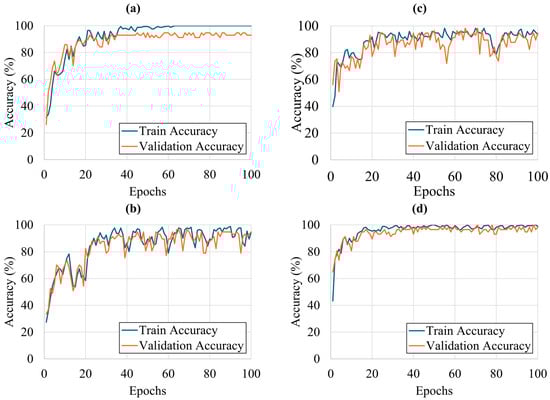 The training and validation accuracies of the following: (a) MobileNet; (b) ResNet50v2; (c) GoogleNet; (d) EfficientNet.