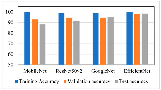 To better understand the implemented models, other evaluation metrics were studied. Table 3 shows the precision, recall, and F1-score of the various TL models used in this study. For precision, which is the correctness of the true prediction, the EfficientNet model correctly predicted with the highest precision value of 98.41%, while MobileNet attained an accuracy of 88.33%, representing the lowest performance among the four models evaluated. The precision, recall, and F1-score exhibited slight increases yet correspond to a comparatively lower accuracy. These results suggest that although MobileNet demonstrates satisfactory performance, it is outperformed by the other models in attaining a balanced trade-off between precision and recall, yielding an F1-score of 88.44%. ResNET50v2 shows enhanced performance, achieving an accuracy of 91.67%, as well as superior precision, recall, and F1-score, in comparison to MobileNet. This indicates that ResNET50v2 demonstrates greater reliability in data classification and maintains an effective balance between false positives and false negatives. The F1-score of 91.53% indicates consistent and comprehensive performance across essential metrics. GoogleNet also demonstrates enhanced performance, attaining an accuracy of 95.00%, along with comparable precision, recall, and F1-scores, all of approximately 95.00%. GoogleNet demonstrates high performance in both precisions by minimizing false positives and recall and by minimizing false negatives, thereby proving to be effective for classification tasks. EfficientNet achieves superior performance compared to the other models, attaining an accuracy of 98.33%, with precision, recall, and F1-scores also of 98.33%. The computational overhead of each model varies based on its design and intended use. MobileNet is lightweight with minimal overhead, making it ideal for resource-constrained environments. ResNet50v2 offers a balanced trade-off between performance and efficiency. GoogleNet has a moderate computational load, which is suitable for tasks requiring higher complexity. ResNet101 is more computationally heavy, offering high accuracy at the cost of significant training time. InceptionV3 is demanding and optimized for accuracy but requires considerable resources. VGG16 is expensive, both in terms of parameter size and training time, which makes it resource intensive. Lastly, EfficientNet is optimal, offering top-notch accuracy with low computational overhead, striking the best balance between performance and efficiency.