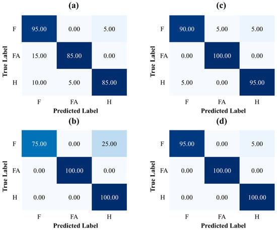 Confusion matrix for classification results of healthy (H), faulty (F), and faulty aged (FA) data for the following: (a) MobileNet; (b) ResNET50v2; (c) GoogleNet; (d) EfficientNet.