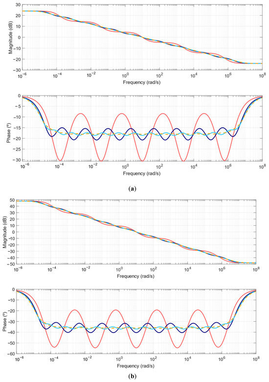 However, to accurately represent phenomena within certain frequency ranges, it is necessary either to increase the degree of the approximation method functions or to employ more advanced methods, such as the Oustaloup recursive method, which is the most frequently used continuous approximation method [36]. The generalized Oustaloup’s recursive method for a fractional derivative of order λ is defined in (1)–(4), for a frequency range of where the N-degree polynomial approximation is valid and where and are obtained through recursive equations: