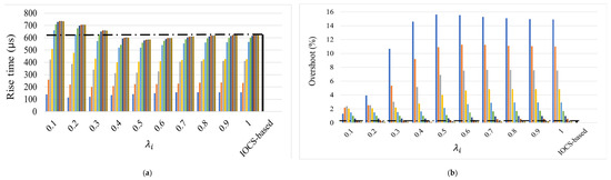 As for the rise time, the mark reached by the IOCS-based DC motor is 624 μs in both speed and torque signals subjected to the predefined steps. The reduction in helps to reduce this mark further, reaching a minimum of 250 μs with = 0.6 and 100 μs with = 0.1, while closer values to 1 are near the IOCS-based DC motor mark. In contrast, does not have such a significant effect on the rise time as . Anyway, there are low values of ( ≤ 0.3) paired with high values of ( ≥ 0.5) that worsen the rise time of the IOCS-controlled DC motor. Values of and outside this range improve the rise time of the IOCS-based DC motor.