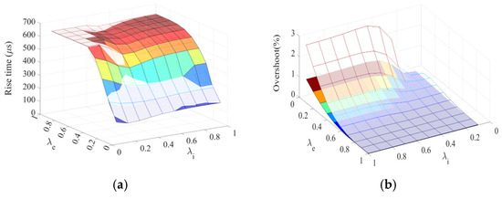 Impact of different λi and λe values on the metrics of the FOCS-based DC motor under the predefined speed step (95% to 100% of the rated speed value): (a) rise time (μs) of speed signal, (b) overshoot (%) of speed signal, (c) peak current due to the speed step and (d) peak torque due to the speed step. The black dashed lines in subfigures pinpoint the results of the IOCS-based DC motor.