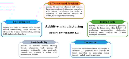 AM is a key player in the opportunities presented by Industry 4.0 and Industry 5.0. It offers transformative capabilities that align with the core principles of these industrial paradigms [50,51]. AM becomes part of smart manufacturing when it integrates digital technologies, real-time monitoring, data-driven optimization, connectivity, customization, predictive maintenance, and human–machine collaboration. This ensures that AM processes are efficient, adaptable, and aligned with smart manufacturing. Smart manufacturing uses IoT, AI, big data, and cyber–physical systems (CPS) to optimize production, enhance productivity, and improve quality. AM, or 3D printing, is integral to this system, enabling precise and customized production. Figure 2 highlights the advantages of integrating Industry 5.0 with AM over Industry 4.0, with improved efficiency, precision, human roles, customization, sustainability, and innovation. Industry 5.0 introduces human-centric collaboration, enhancing AM’s potential in modern manufacturing.