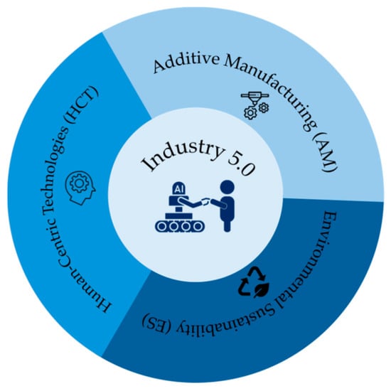 Industry 4.0, also known as the Fourth Industrial Revolution, integrates digital technologies such as cyber–physical systems, IoT, AI, and big data into manufacturing processes, creating more efficient, accurate, and customized production systems [69,70,71]. By 2013, Industry 4.0 had revolutionized global manufacturing, improving efficiency and supply chain management. The emergence of Industry 5.0 in the late 2010s addressed the limitations of automation by focusing on human–machine collaboration, sustainability, and resilience. Industry 5.0 advocates for the symbiosis of human creativity and machine precision, ensuring that technology complements rather than replaces human capabilities [28,33,57,72,73]. This shift aims to create sustainable manufacturing systems that reduce waste, enhance energy efficiency, and adapt to changing market demands. AM plays a pivotal role in the opportunities offered by both Industry 4.0 and 5.0, aligning with their core principles [27,41,42,53,55,74,75].