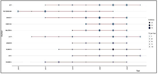 Figure 6 presents a timeline analysis of publication and citation activity for key authors in AM and Industry 4.0/5.0. Each author’s annual publication output is shown by circles, where size indicates the number of articles published and color intensity reflects the total citations. Li Y stands out as a consistently productive author, with notable publication and citation peaks in 2021. Kumar S also saw significant activity in 2021, with multiple impactful papers and high citation impact, suggesting strong academic resonance. Tentzeris MM demonstrates steady publication, with high citation impact, especially in 2016 and 2017, indicating lasting relevance. Zhang Y’s work in 2017 and 2018 shows high publication and citation levels, signaling key contributions to the field. Authors like Demir AG and Haleem A maintain consistent, though smaller, outputs, indicating ongoing research efforts. This visualization highlights shifts in publication and citation trends, offering insights for stakeholders in AM to make informed decisions on research, collaboration, and funding.