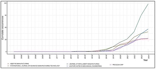 Figure 7 illustrates the cumulative publication occurrences from five key journals on manufacturing and engineering from 2005 to April 2024, showing growth patterns and shifts in research focus. The graph reveals significant exponential growth in the journal AM, which began around 2016 and continued sharply through 2024, reflecting the increasing relevance of additive manufacturing (AM) in industrial applications. The Journal of Intelligent Manufacturing also shows a steady upward trend, starting in 2005, indicating sustained interest in intelligent manufacturing systems that incorporate AI, machine learning, and IoT. The International Journal of Advanced Manufacturing Technology and Lecture Notes in Mechanical Engineering display moderate, consistent growth, signaling ongoing contributions in mechanical engineering and manufacturing technologies. Procedia CIRP started later but saw rapid growth from 2012 onwards, highlighting its emerging importance in disseminating research and conference proceedings. Overall, the trends emphasize the rising significance of AM and intelligent systems, driven by technological advancements and the industrial demand for more efficient, flexible, and innovative solutions. These data provide valuable insights for researchers and practitioners in strategic decision-making for future research and technology development.