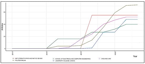 Figure 8 presents a trend analysis of scholarly articles published from 2013 to 2022 by five distinguished institutions: the Institute of Strength Physics and Materials Science SB RAS, Politecnico di Milano, the School of Electrical and Computer Engineering, University College London, and Zhejiang University. The plotted trajectories illustrate the annual publication output of each institution, providing insights into their research activity and prominence in the field over the given period.
