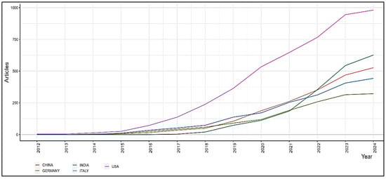 Figure 10 indicates the growth in the number of scholarly articles published by researchers in China, India, Germany, Italy, and the USA from 2012 to April 2024. This longitudinal analysis offers a window into the research output dynamics of these countries in the context of a particular academic field, potentially reflecting broader trends in research and development priorities, funding allocations, and the overall health of the academic environment of these nations. Exhibiting a leading edge at the start, the USA showed a gradual increase in publications until about 2019, followed by a sharper rise continuing into 2024. This indicates sustained investment in research, with the acceleration possibly taking place due to increased funding or a strategic emphasis on certain research domains. Starting from a significantly lower point than the USA, China demonstrated a steep and almost exponential growth in publications around 2019, eventually surpassing the USA by 2023. This dramatic rise could be indicative of major governmental investment in research and education, reflecting China’s aggressive push to become a global leader in scientific research. India’s publication trajectory started lower but showed consistent growth throughout the period. The steady rise suggests the continuous enhancement in research capabilities and, possibly, improvements in higher education and research infrastructure. Germany and Italy show moderate but stable increases in research output over the analyzed period. The growth is less pronounced compared to China and the USA but indicates a solid, ongoing commitment to research within the European context.