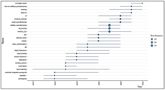 Figure 11, depicting the frequency of specific terms across the academic literature from 2014 to 2024, provides a clear narrative about evolving focus areas in manufacturing, technology, and innovation. It captures how certain technologies such as ‘AM’ and ‘3D printing’ have maintained a consistent and growing academic interest, reflecting their continued advancement and broader application across industries. Similarly, the terms ‘industry 4.0’, ‘ai’, and ‘machine learning’ show an upward trend, underscoring the digital transformation sweeping through various sectors, with a growing emphasis on automation and data-driven decision-making. Emerging technologies such as ‘wireless sensor’, ‘smart skins’, and ‘flexible electronic fabrication’ began to appear more prominently towards the latter part of the decade, indicating the transition from nascent stages to more recognized fields of study with tangible applications, particularly in wearable technology and IoT. The specific focus on manufacturing techniques, like ‘wire arc AM’, ‘selective laser’, and ‘laser sintering’, highlights the detailed exploration of niche areas within manufacturing, responding to both technological advances and industry demands. The graph shows that as the decade progressed, the importance and impact of technologies that intersected multiple sectors grew. It also indicates a shift towards more specialized areas. This shift is characterized by the adoption of innovative technologies and their integration into existing industrial practices. This points to a broader trend of technological convergence, where digital fabrication, AI, and advanced materials science come together to create sophisticated solutions. On the other hand, the analysis of term frequencies provides essential insights into technological research trends. This information is crucial for directing future research efforts, informing educational strategies, and guiding policy and investment decisions in technology development and implementation. The graph reflects past, present, and future research dynamics in technology and innovation.