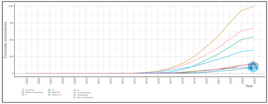 Figure 12 presents a compelling visualization of the cumulative occurrences of various technological and industrial terms from 2005 to 2024, illustrating significant trends in academic and industrial focus areas over nearly two decades. Each line represents a specific term, tracking its trajectory through the academic literature, and offering insights into the evolving priorities and advancements within the fields of manufacturing and technology. Starting from a baseline where most terms showed minimal activity, there was a clear inflection point around the early 2010s when these terms began to show distinct upward trends. This period likely corresponded with technological advancements and increased investments in research and development, which drove the interest and scholarly output in these areas. The terms ‘3d_printing’ and ‘additive_manufacturing’ led in terms of frequency, with steep ascents beginning around 2016, reflecting the rapid adoption and integration of these technologies into various sectors. This surge in research activity correlated with the broader industrial adoption as these technologies matured and became more accessible. The growth in these terms indicates their central role in driving innovations in manufacturing, creating more efficient, cost-effective, and customizable production methods. The term ‘industry_4_0’, which encapsulates the move towards automation and data exchange in manufacturing technologies, also shows significant growth, especially from 2017 onwards. This growth is paralleled by similar increases in ‘IoT’ (Internet of Things) and ‘AI’ (artificial intelligence), highlighting a broader shift towards smart manufacturing processes that leverage data analytics and machine learning to optimize production and operations. Interestingly, ‘digital_twin’—a technology that pairs the virtual and physical worlds to analyze data and monitor systems—begins to appear later in the timeline but rapidly increases in frequency. This reflects its emerging importance in optimizing the operation and maintenance of physical systems and in predictive analytics. The consistent rise in the occurrences of these terms through 2024 not only suggests robust engagement within these research areas but also indicates the potential for ongoing contributions to technological innovation and development. These trends demonstrate the dynamic nature of technological research, which continues to evolve rapidly in response to new challenges and opportunities. Overall, the graph underlines the shift in academic and industrial landscapes towards more digital, automated, and data-driven environments. Understanding these trends is essential for researchers, policymakers, and industry leaders as they navigate the complexities of modern manufacturing and strive to harness the potential of new technologies to revolutionize production processes and enhance operational efficiencies. The trajectory of these terms offers predictive insights into future research areas that are likely to continue attracting substantial academic and industrial investment.