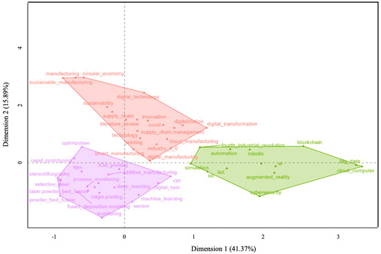 In this study, we used the evaluative approach as well as the relational approach to assess the intellectual and conceptual structures of AM in the era of Industry 4.0 and 5.0. The evaluative approach explores the authors, papers, journals, institutions, and countries with the greatest influence in conceptual research on AM in the era of Industry 4.0 and 5.0. This study only uses common analysis in the descriptive analysis of the selected database. We established the intellectual structure using co-citation analysis. This method assesses the similarity between authors, journals, or articles [77]. For example, author co-citations refer to the phenomenon in which two authors are cited jointly in one article. This study uses the author’s keyword frequency and co-occurrence to assess the conceptual structure. Co-occurrence, also labeled co-word analysis, reveals the closest keywords or topics through clusters in a field [79].
