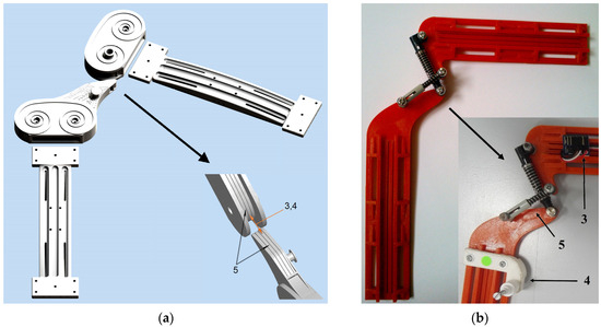 Developed knee joint mechanisms: (a) the three-dimensional cam prototype with an additional magnified view that clarifies the principle of operation by showing the cooperating profiles of the cams (3, 4) and the guide grooves (5); (b) the functional dampers prototype built using the dampers (5), with a visible (in the magnified view) IMU sensor (3) and the white element (4) used to fix the linear motor.