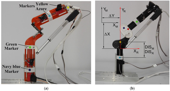 Individual images (frames) were extracted from the recordings taken during the experiment at a rate of 30 frames per second. Each was examined to identify the colour markers defined in RGB as averaged over a marked circular area (Figure 9a). The settings of the analysis program, in particular the range of colour shades, had to be changed for each experiment and marker colour (Figure 9b, misrecognition) to enable the accurate detection of marker displacement (Figure 9c). A similar procedure was applied for each experimental mode, enabling the tracking of the x and y positions of the markers, relative to the coordinate system defined in MATLAB (Figure 5b—black XM, YM). The use of a scaling factor also allowed for the results to be aligned with the value of the actual movement. This was achieved by comparing the physical distance (DISR) between two colour markers on the prototype when the tibia is immobile (Figure 5b), and the measured distance between these markers in MATLAB (DISM). To obtain locations according to the origin of the coordinate system on the physical prototype (Figure 5b—red XR and YR), the resulting positions were further recalculated (using ΔX and ΔY according to Figure 5b).