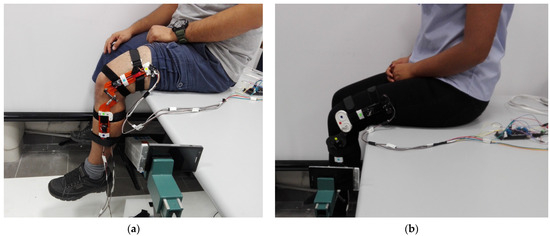 The two volunteers were male and female, both in the age range of 25–30 years old. They took part in the tests for both prototypes in modes 3 and 4, as shown in Figure 6a,b. At least three trials were conducted for each prototype and volunteer, involving ten repetitions of the flexion/extension movement. The prototype was attached with Velcro straps to the volunteer’s left lower limb.